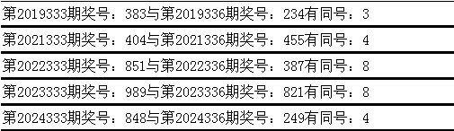 与前期历史同时奖号对比分析,在最近五年开奖中,第333期同时奖号与第336期同时奖号王人出现了雷同号码: