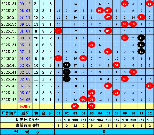 后隔离析:上期后区奖号为04和05,最近5期后区和值分别为12、11、19、13、9,后区跨度分散界限在1-8,本期后区提防两码03、05。