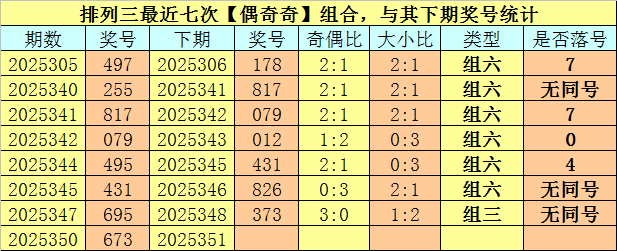 奇偶分析:胪列三上期奖号为673,其奇偶类型为【偶奇奇】,最近七次出现奇偶类型偶奇奇的号码别离为:497、255、817、079、495、431、695,其下期奖号别离为:497、255、817、079、495、431、695。其中号码奇偶比为12:9,奇偶奖号开出比例基本十分,本期奇数热出的可能性较大,预测出现2个奇数号码。
