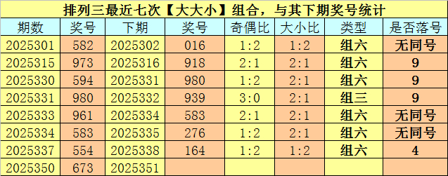 大小分析:胪列三上期开出号码673,大小类型为【大大小】,最近七次开出大小类型大大小的奖号别离为:582、973、594、980、961、583、554,其下期别离开出号码:016、918、980、939、583、276、164。其中号码大小比为12:9,大小 号码出现次数基本十分,本期审视大号转热,看好出现2个大号。